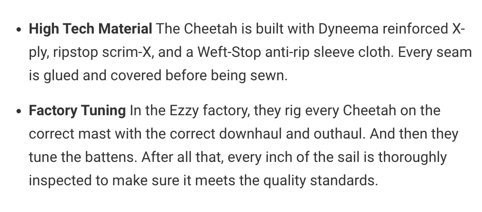 You can own fewer sails, the Cheetah has a huge wind range. It’s built with scrim, Dyneema X-Ply, and RBS epoxy battens. The calibrated downhaul marks take the guesswork out of rigging. Every Cheetah is pre-rigged in my factory before it ships.